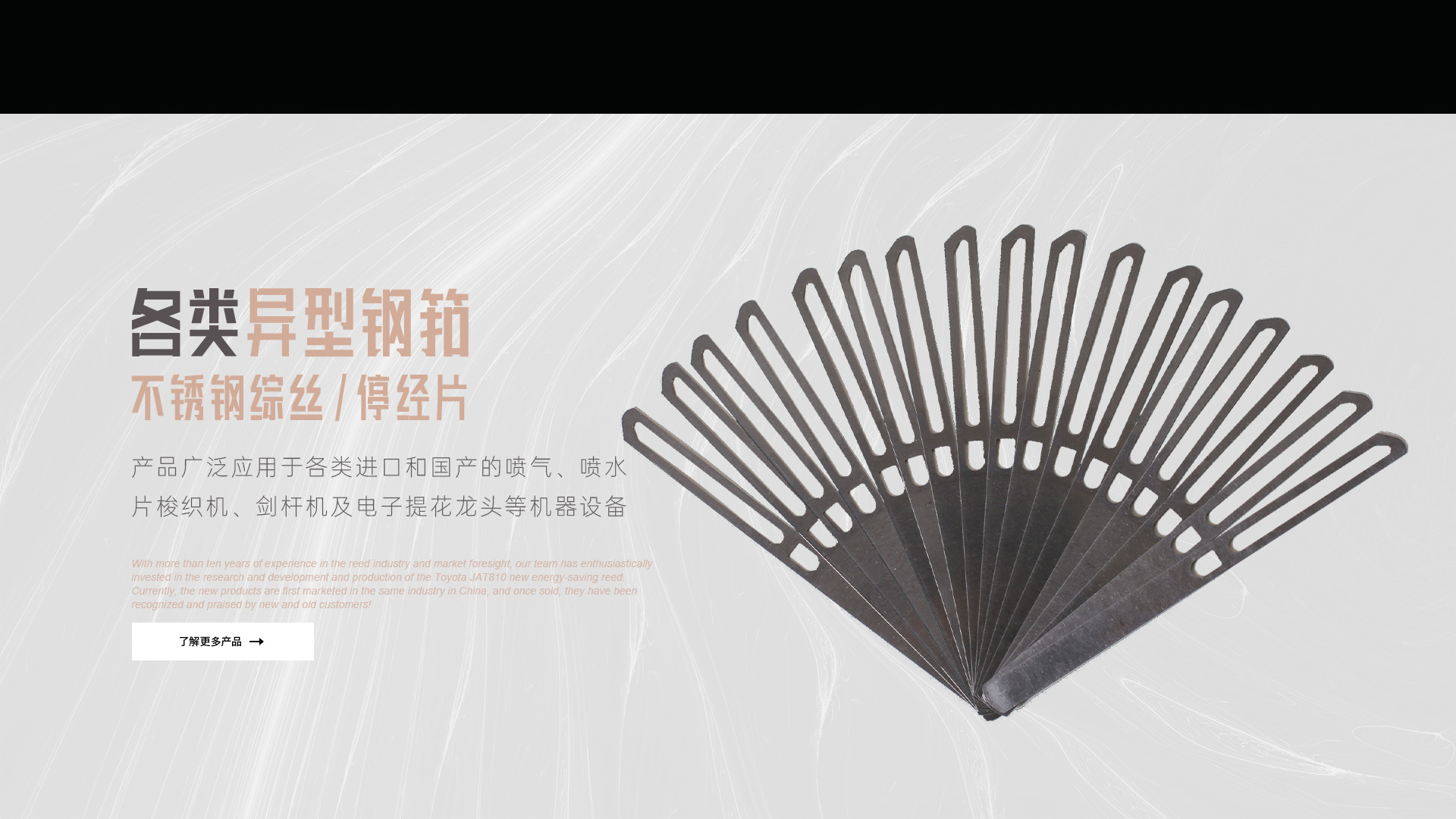 公司主要產品有:噴氣織機用各類異型鋼筘(傳統型豐田JAT710鋼筘及新研發(fā)的豐田JAT810節(jié)能筘);不銹鋼綜絲及不銹鋼停經片。我們的產品廣泛應用于各類進口和國產的噴氣、噴水、片梭織機、劍桿機及電子提花龍頭等機器設備。